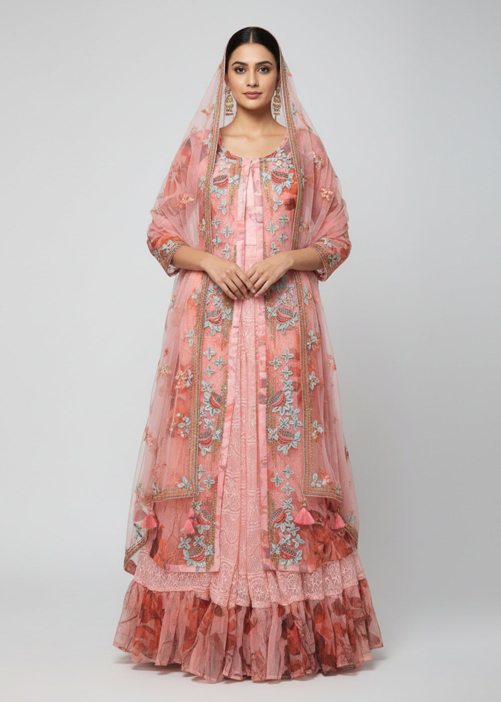 Floral Printed Layered Anarkali Dress with Embroidered Jacket – Elegant Ethnic Wear